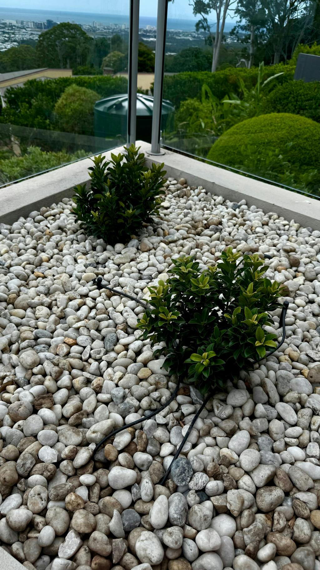 Snow maiden used with white pebbles. Wanted a nicely shaped green leaf that is easy to maintain and not too tall. It does have watering system but I am assured it will be tolerant once it is more mature. Hardy for its location.